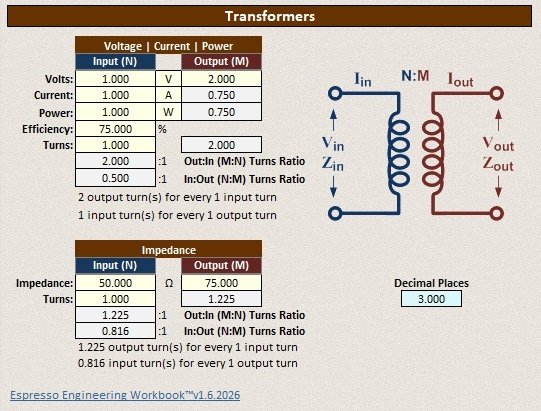 Espresso Engineering Workbook™ (click to download), is a collection of electrical engineering and physics calculators