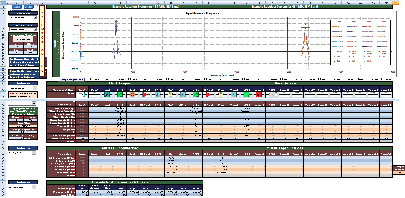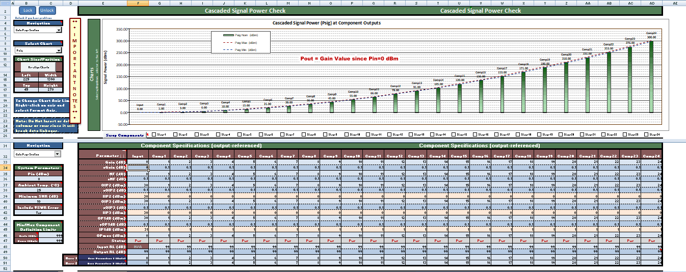 of RF Cascade Workbook for many parameters based on the input values shown in the