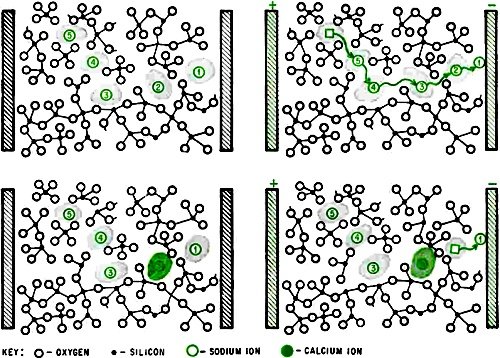 causes the ions to move between the glassy chains (upper right). The stronger bond