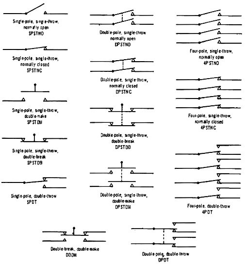 as single-pole, single-throw, normally open. Standard terminology and circuit arrangements