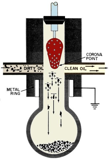 ring in electrostatic oil filter precipitates dirt into trap, as shown in pictorial