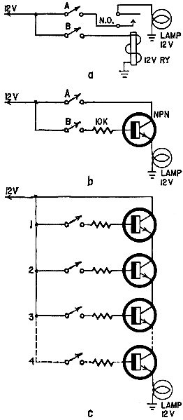 close and the lamp light. The same function with semiconductors (Fig. 3-b) takes