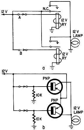 the relay and light the lamp. When you examine the solid-state version in Fig. 2-b,
