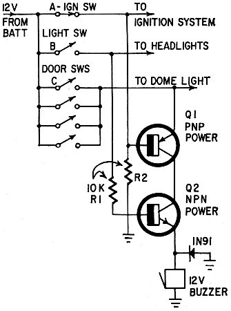 Fig. 6 - Headlight alarm shows how logic circuits can be turned