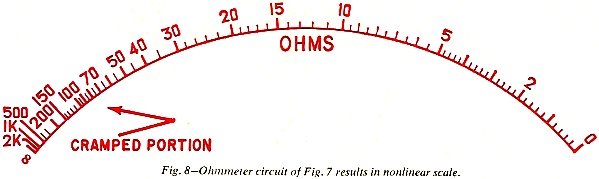 Fig. 8 - Ohmmeter circuit of Fig. 7 results in nonlinear scale.