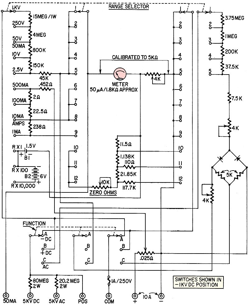 The complete circuit for a standard vom is shown in Fig. 15. The fuse in the