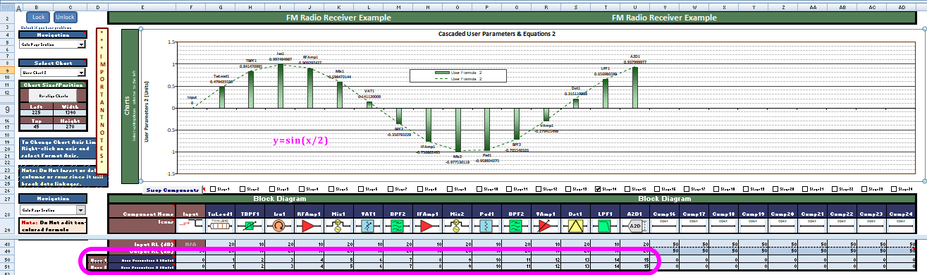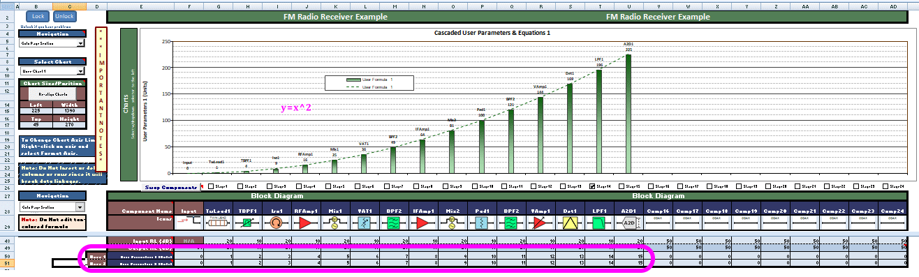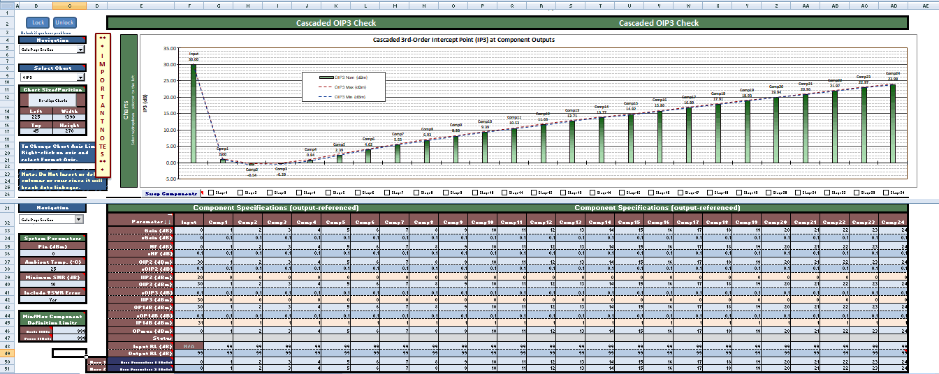 of RF Cascade Workbook for many parameters based on the input values shown in the
