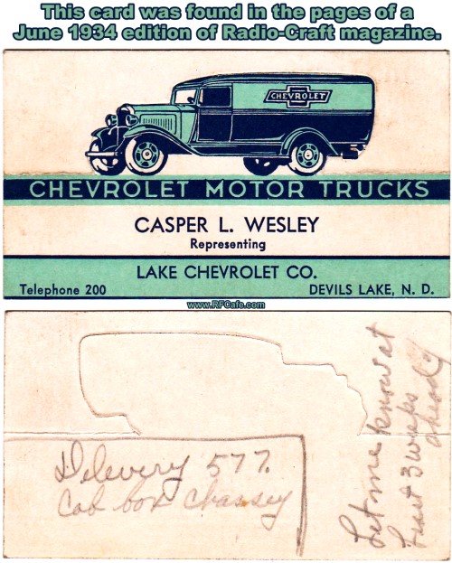 this business card from the Lake Chevrolet Company, of Devils Lake, North Dakota.