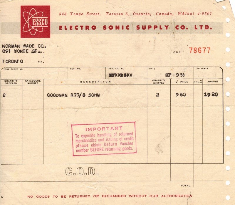 C.O.D. Receipt from Electro Sonic Supply Co. Ltd., c. 1958