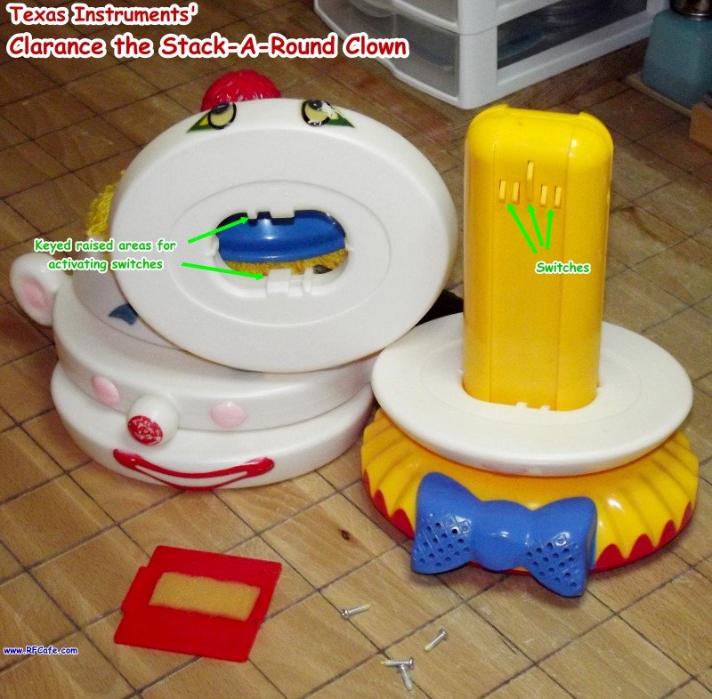 the Stack-A-Round Clown apart to see what makes him tick (or talk, as the case happens