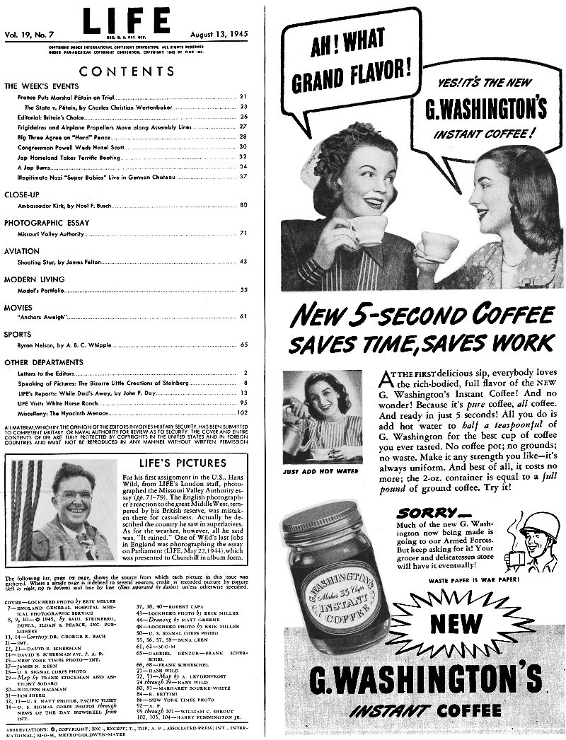August 13, 1945 Life Magazine Table of Contents