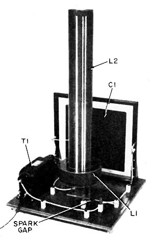 through a spark gap into primary coil L1 (20 turns of heavy wire). This generates