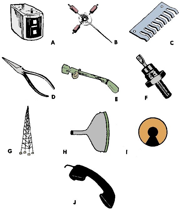 the common electronic terms listed below (1 - 10) with the sketches (A - J) of the