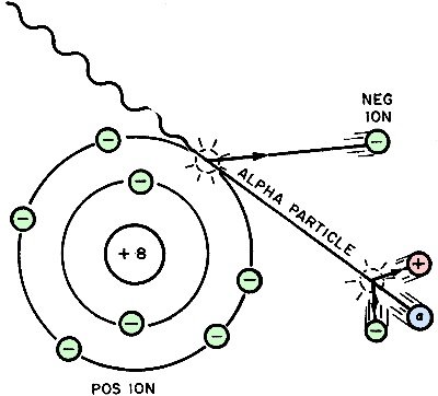 dislodged by the alpha particle becomes a negative ion, while the remainder of the