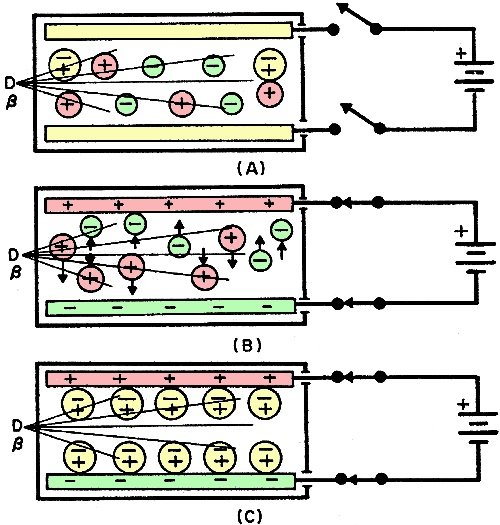 and the positive ions to the negative electrode. Eventually, as shown in C, the