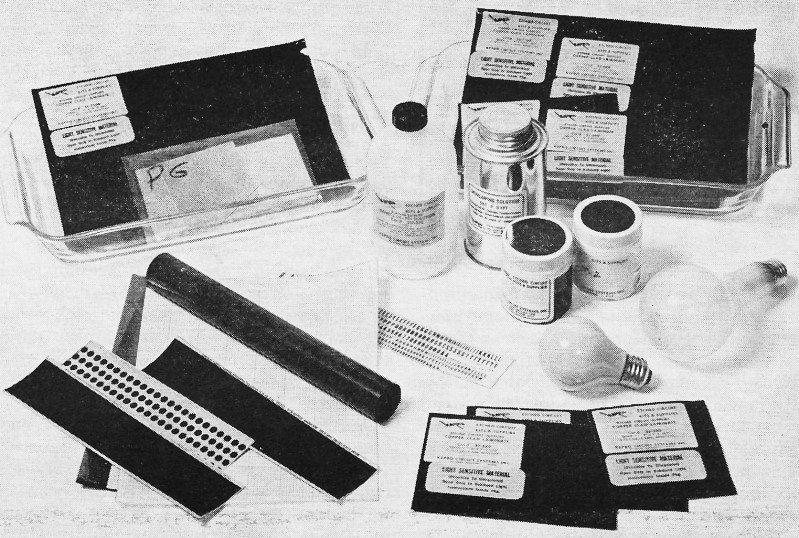 kits have photo-resist and include photo-flood lamp.
