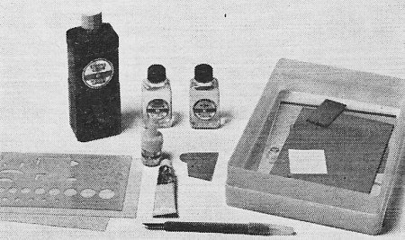 resist, and tape-and-dot resist; etchant comes as crystals to be mixed with water;