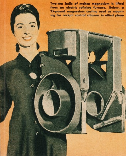 refining furnace. Below, a 25-pound magnesium casting used as mounting for cockpit