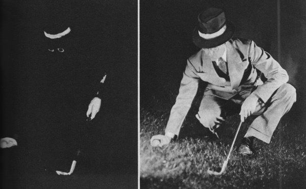 At the right the golfer is photographed by flashlight; at left, he's in a blackout.