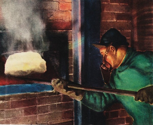 ores, is to roast out impurities in the furnace. This is a scene at Eldorado refinery,
