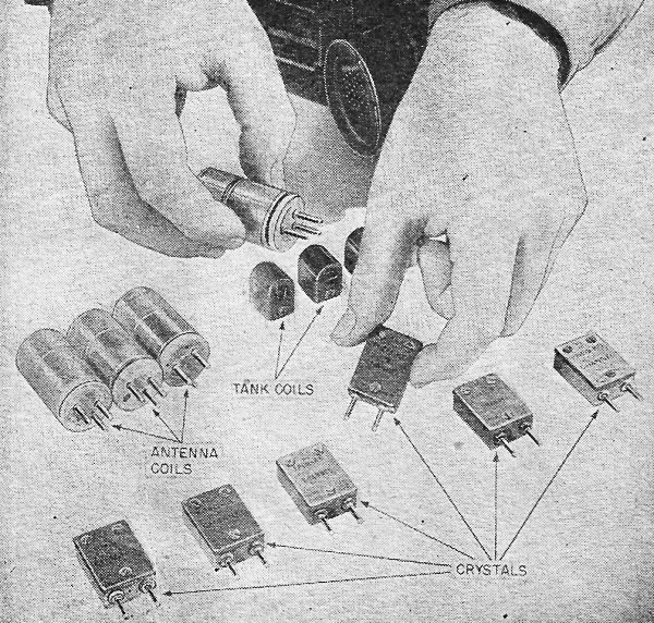 The receiver is tuned by inserting coil and crystal combinations for the desired
