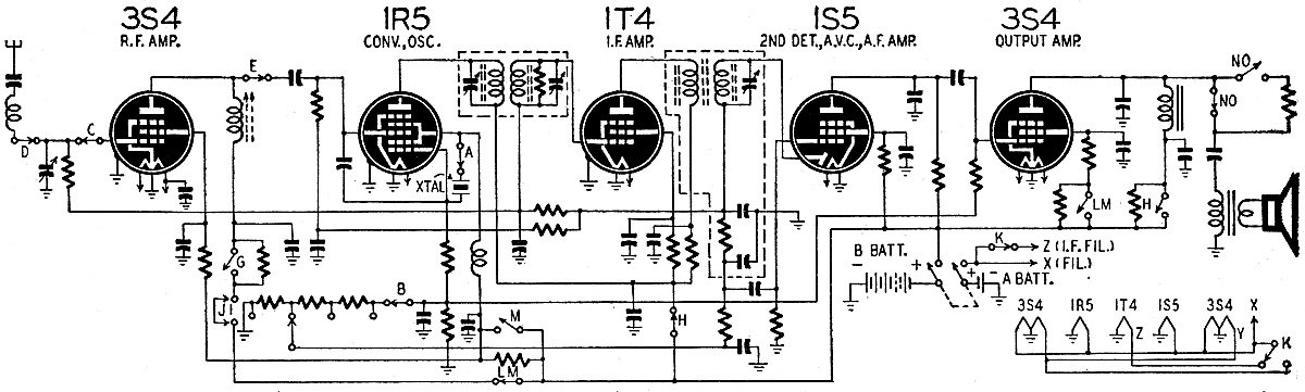 The 1T4 and 1S5 are connected in the standard i.f. and second detector circuits