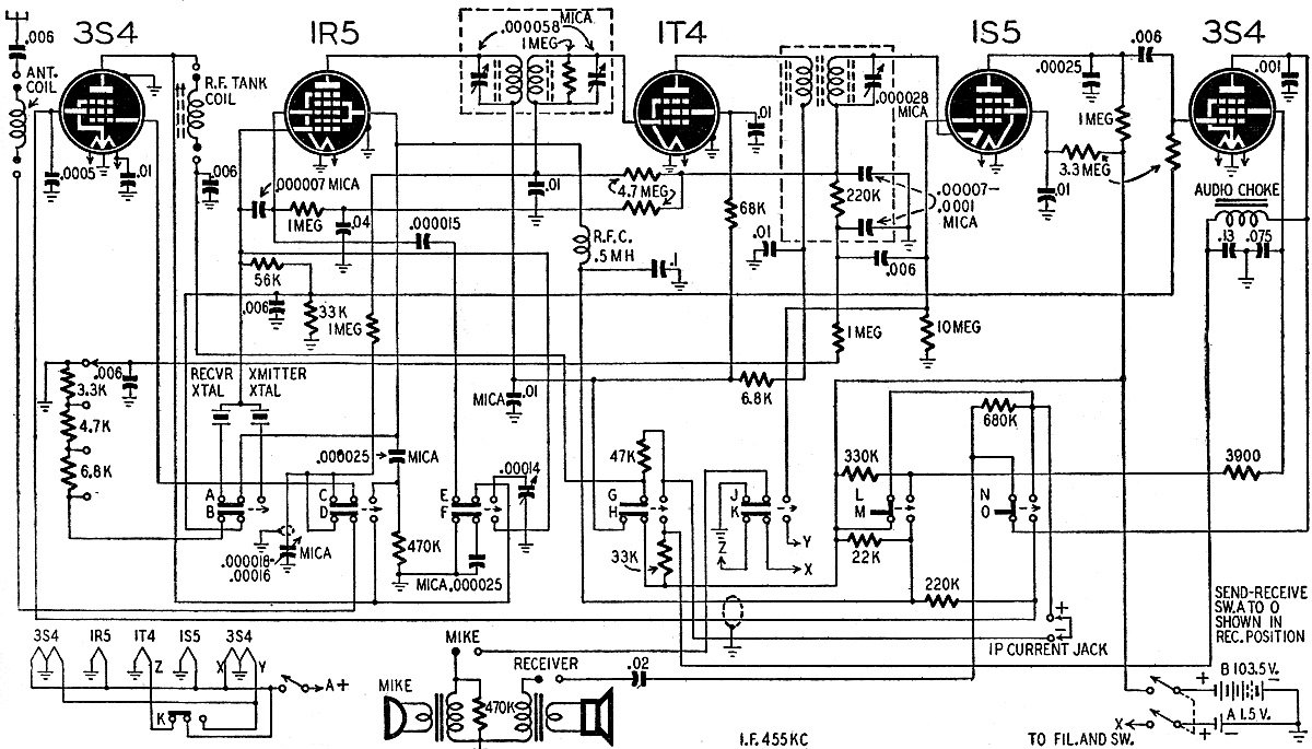 to frequencies 455 kc apart. The 1R5 acts as a Pierce oscillator in both transmitting