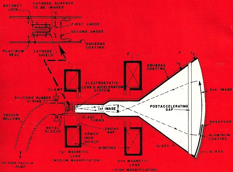 and a larger second magnetic coil (lenses) surrounding the tube neck represent the