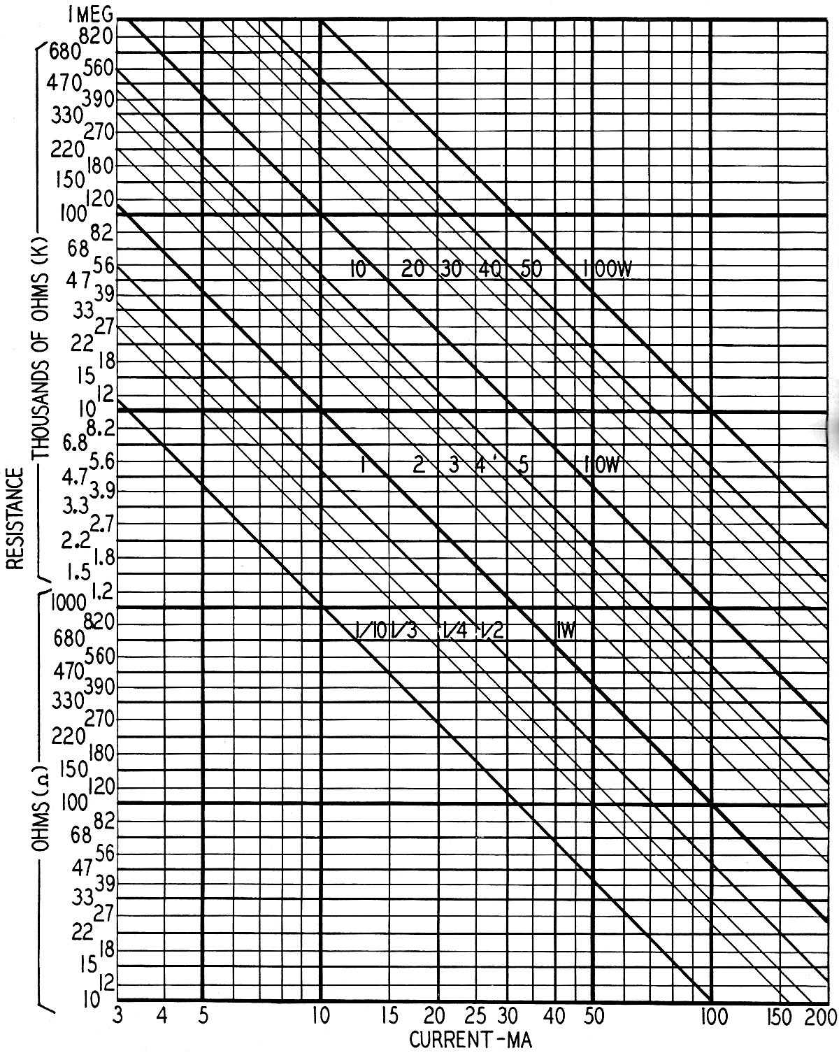 it must carry. The chart shows how much current may flow without overheating a resistor