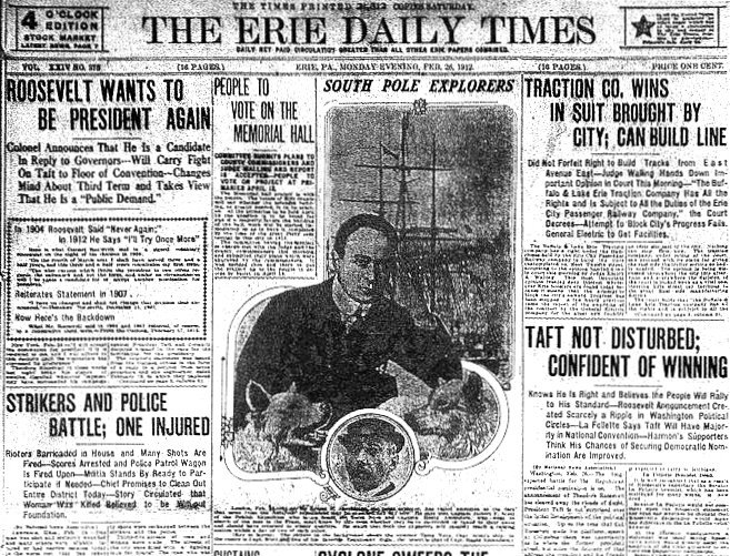 The Erie Daily Times newspaper with a lead story about Antarctic exploration.
